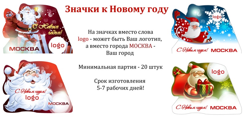 Если Вы решите не сильно тратиться на изготовление значков со своим логотипом, то мы предложим Вам недорогие закатные значки с символикой Нового года, которые Вы сможете использовать на все новогодние праздники. Новогодние закатные значки смотрите здесь.